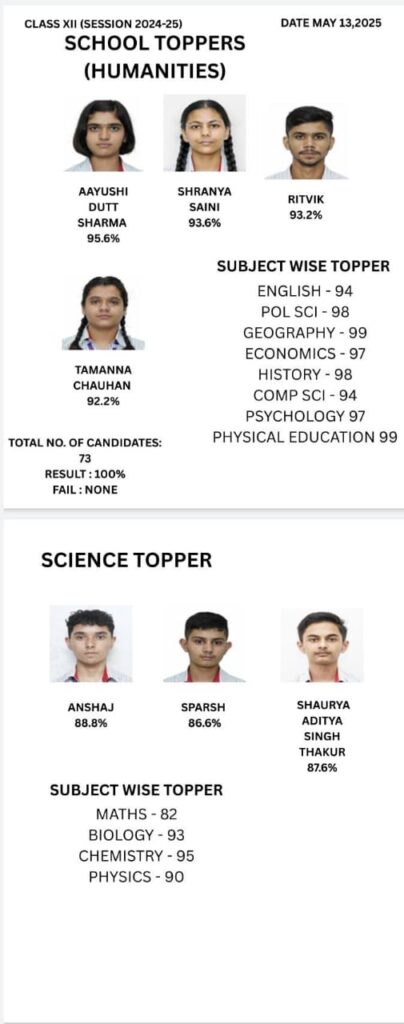 श्ररण्या सैनी 93.6% , रित्विक – 93.2% अंकों के साथ क्रमश: द्वितीय तथा तृतीय स्थान प्राप्त किया।