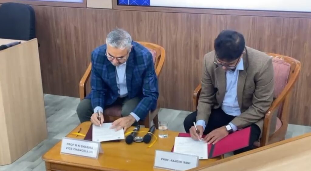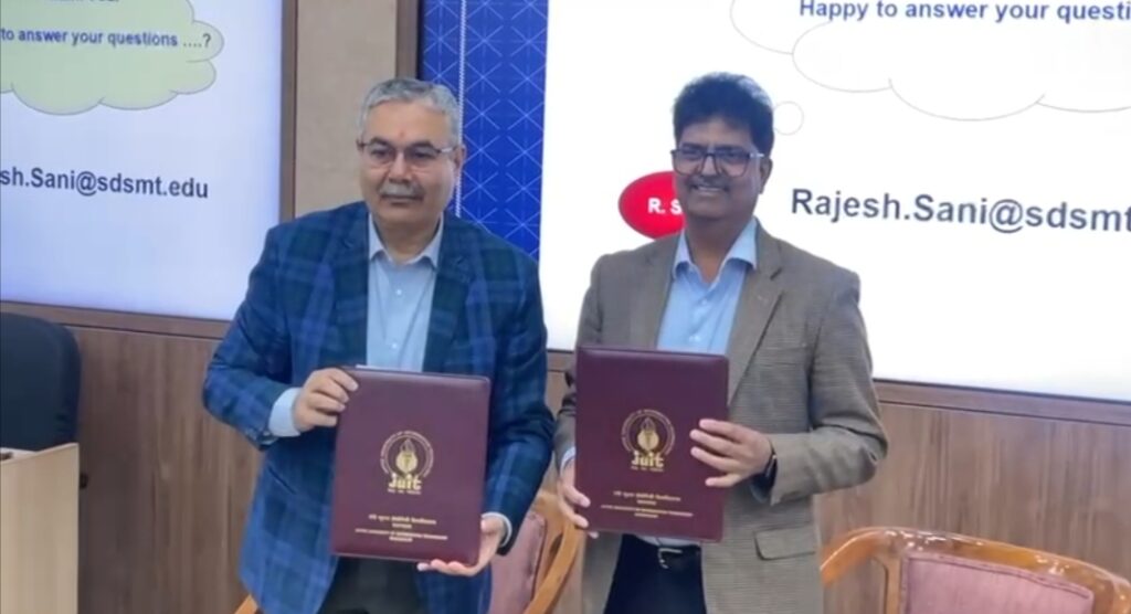 एमओयू पर हस्ताक्षर जे.यू.आई.टी. के कुलपति प्रो. (डॉ.) राजेन्द्र कुमार शर्मा और साउथ डकोटा माइन्‍स के डिस्टिंग्विश्ड प्रोफेसर एवं डायरेक्टर (MASON) डॉ. राजेश सानी ने किए।