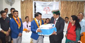 स्वास्थ्य एवं परिवार कल्याण, सामाजिक न्याय एवं अधिकारिता तथा श्रम एवं रोज़गार मंत्री कर्नल डाॅ. धनीराम शांडिल ने आज स्पेशल ओलम्पिक वल्र्ड समर गेम्ज में बास्केटबाॅल की टीम प्रतिस्पर्धा में स्वर्ण पदक हासिल करने वाले खिलाड़ी अभिनाश व उनके कोच राज कुमार को सम्मानित किया।