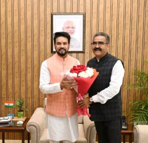 पूर्व इंडस्ट्री मिनिस्टर विक्रम सिंह ठाकुर शुक्रवार को खेल, युवा मामलों, सूचना और प्रसारण मंत्री अनुराग ठाकुर से दिल्ली में शिष्टाचार भेंट की।