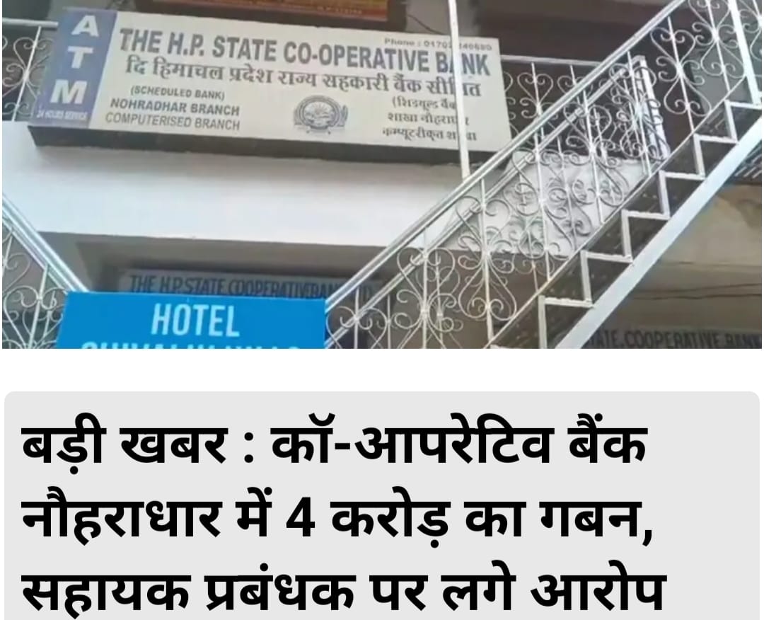 ब्रेकिंग न्यूज़: कॉ-आपरेटिव बैंक नौहराधार में 4 करोड़ का घोटाला सहायक प्रबंधक पर लगे आरोप