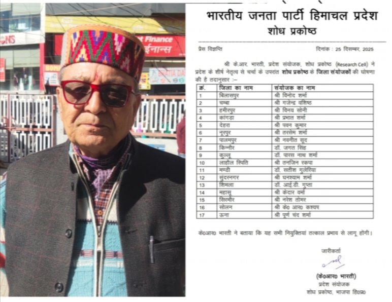 भाजपा ने शोध प्रकोष्ठों की नियुक्तियां कीं, सोलन जिला शोध प्रकोष्ठ के अध्यक्ष बने के.एस. कश्यप