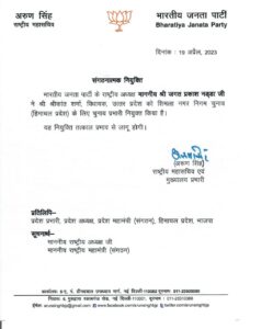 # भारतीय जनता पार्टी के राष्ट्रीय अध्यक्ष जगत प्रकाश नड्डा ने श्रीकांत शर्मा विधायक, उत्तर प्रदेश ,को शिमला नगर निगम चुनाव के लिए चुनाव प्रभारी किया नियुक्त|