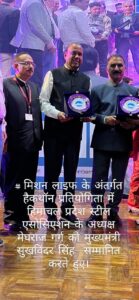 # मिशन लाइफ के अंतर्गत हैकथॉन प्रतियोगिता में हिमाचल प्रदेश स्टील एसोसिएशन के अध्यक्ष मेघराज गर्ग को मुख्यमंत्री सुखविंद्र सिंह सुक्खू सम्मानित करते हुए।
