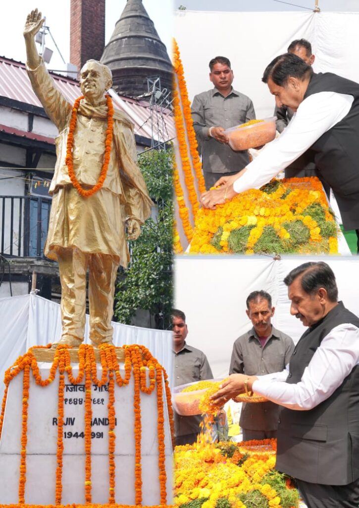शिमला : पूर्व प्रधानमंत्री भारत रत्न राजीव गांधी की पुण्यतिथि के अवसर पर उप-मुख्यमंत्री मुकेश अग्निहोत्री ने आज छोटा शिमला स्थित उनकी प्रतिमा पर पुष्प अर्पित कर श्रद्धांजलि दी। इस मौके पर उन्होंने राजीव गांधी को एक दूरदर्शी नेता और आधुनिक भारत का शिल्पी बताया।