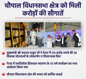 मुख्यमंत्री  जयराम ठाकुर  ने आज चौपाल विधानसभा क्षेत्र के नेरवा में ₹175 करोड़ की लागत वाली 30 विकास योजनाओं के लोकार्पण व शिलान्यास किए।