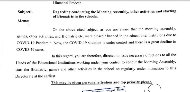 अब स्कूलों में प्रार्थना सभा, खेलकूद गतिविधियों के अलावा शिक्षकों की बायोमीट्रिक हाजिरी फिर से शुरू करने के निर्देश जारी किए गए हैं। प्रार्थना सभा और खेल गतिविधियों के आदेश निजी स्कूलों पर भी लागू होंगे। इस संबंध में उच्च शिक्षा निदेशक डॉ. अमरजीत शर्मा की ओर से निर्देश जारी किए गए हैं।