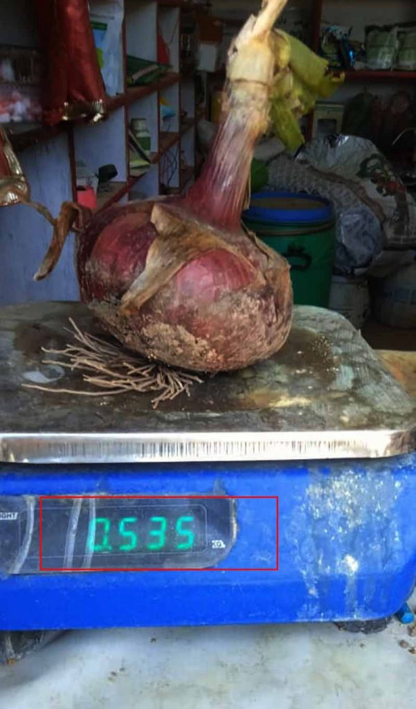 जिला में धर्मशाला विधानसभा हलके की कंद्रेहड़ पंचायत के अग्रणी किसान बलवीर सैणी ने इस बार आधा किलो से ज्यादा वजनी लाल प्याज उगाए हैं। बलवीर सैणी ने आठ कनाल में देसी और हाइब्रिड लाल प्याज बीजा था। पिछले साल जनवरी में रोपाई के बाद अब 135 दिन बाद खेतों से प्याज निकाले तो हाइब्रिड प्याज का वजन आधे किलो से ज्यादा है, जबकि देसी प्याज का वजन चार सौ ग्राम तक है।