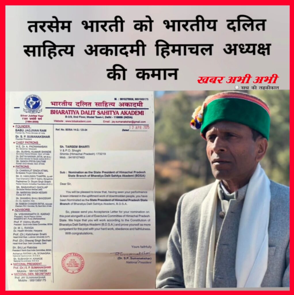 हिमाचल दलित साहित्य अकादमी हिमाचल के अध्यक्ष बने तरसेम भारती,हिमाचल को मिला नया नेतृत्व – बी.डी.एस.ए.