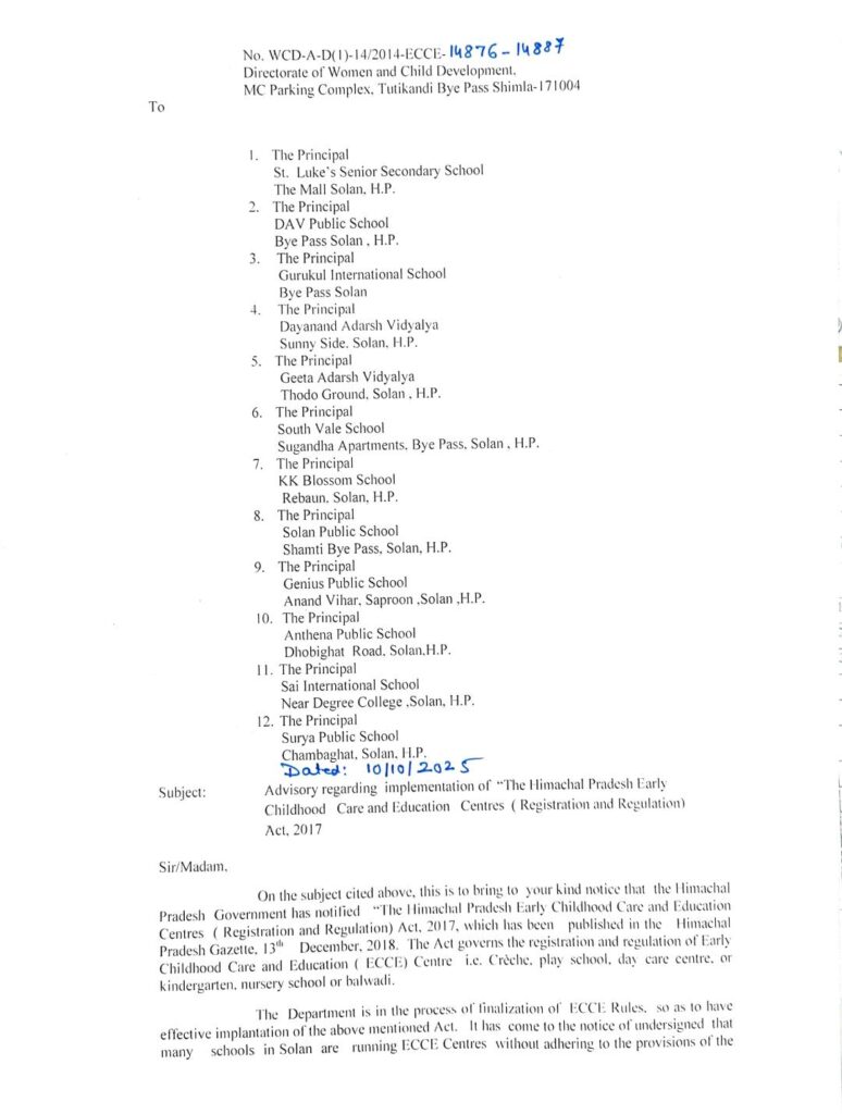 हिमाचल प्रदेश प्रीस्कूल एसोसिएशन ने शिमला और सोलन जिलों में निजी स्कूलों द्वारा Early Childhood Care and Education (ECCE) मानकों के उल्लंघन को लेकर गंभीर चिंता जताई है।